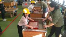 「道の駅おがわまち伝統工芸施設」では、和紙の紙すき体験を実施しました。職人さんに手を添えてもらい和紙作りを体験しました。和紙のでき方や歴史などについて学ぶことができました。